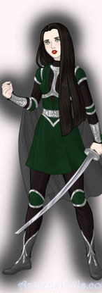Armour: Asgardian, black and green, dark gray cape; black dress and hooded cloak